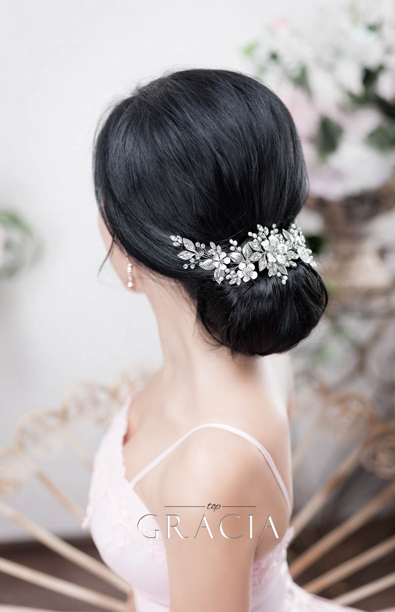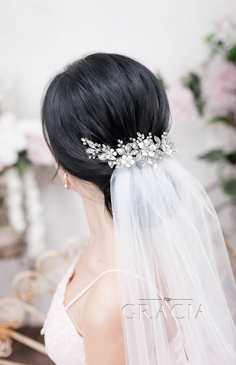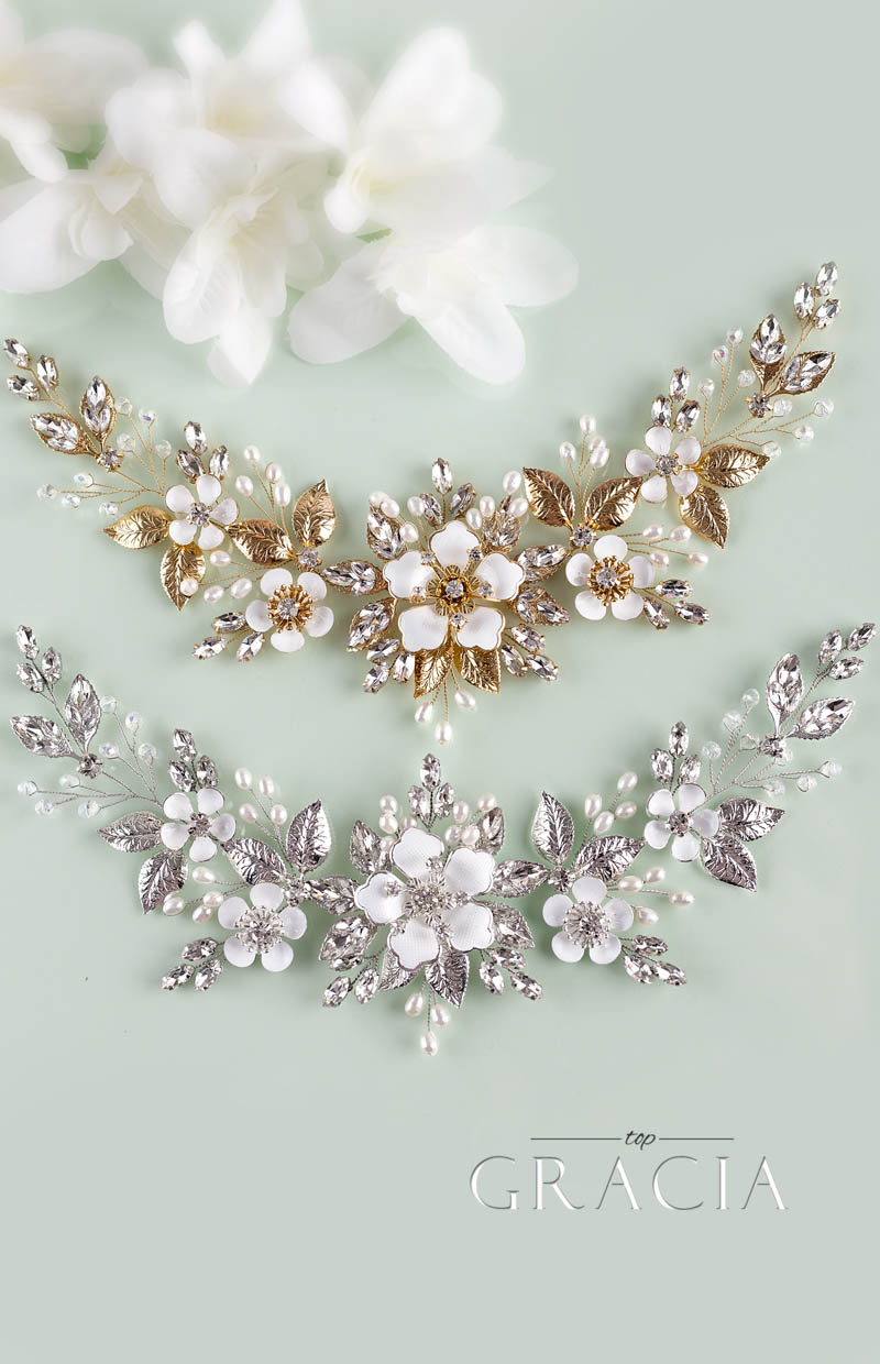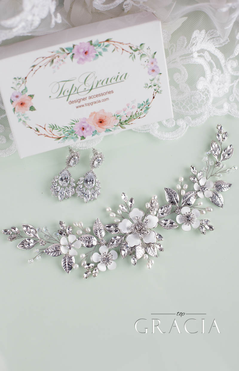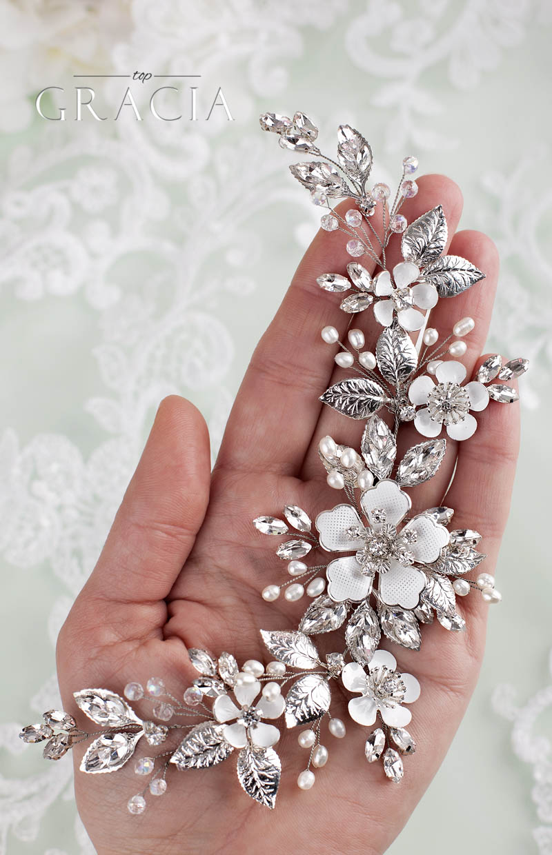 Top materials ready, the scheme of the new hairpiece for wedding ready, we passed to the handcrafting work with high spirits. We used high-quality jewelry wire that ensured lightweight, flexible and at the same time highly durable basis for the decoration. Then we created the decoration separately by combining branches of silver metal leaves and enameled flowers. Adding dazzling crystals in marquise cut to gleam in different colors under the sun's rays and little freshwater crystals that would emphasize the beauty of local cerulean seas, we could consider the project completed! To bring all these together, we used premium quality glue specially created for jewelry making.